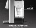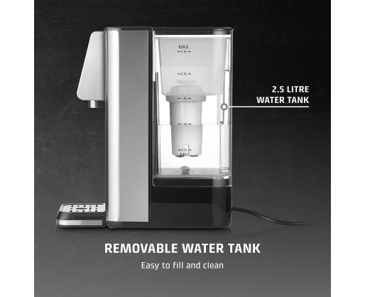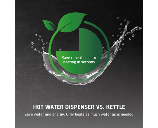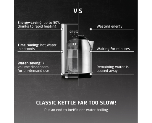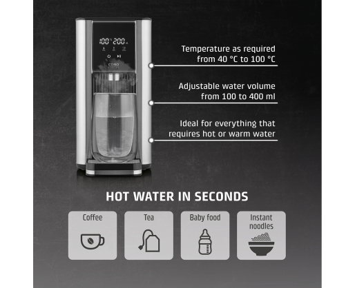 | Kitos savybės | 7 pre-set quantities as required: 100/150/200/250/300/350/400 ml and continuous; Perfect for the preparation of tea, instant coffee, instant noodles and baby food; Energy-saving: 50% less than conventional electric kettles; 13 different temperature settings: 40-100 °C (in 5 °C intervals) and without heating; Direct selection button for preparation of baby food (37 °C) |