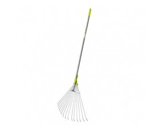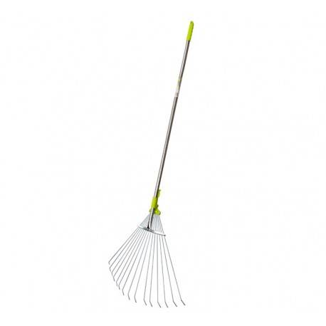 Su vėduoklės formos lapų grėbliu lengvai sutvarkysite sodą. 15 kokybiškos vielos strypelių, grįžtančių į darbinę padėtį netgi juos sulenkus. Padidinto skersmens aliuminio rankena yra lengva ir tvirta. Stūmoklio tipo fiksatorius patikimai fiksuoja strypelių išsiskleidimo lygį. Ergonomiška guminė rankena neleidžia įrankiui išslysti iš rankų.