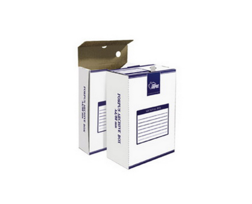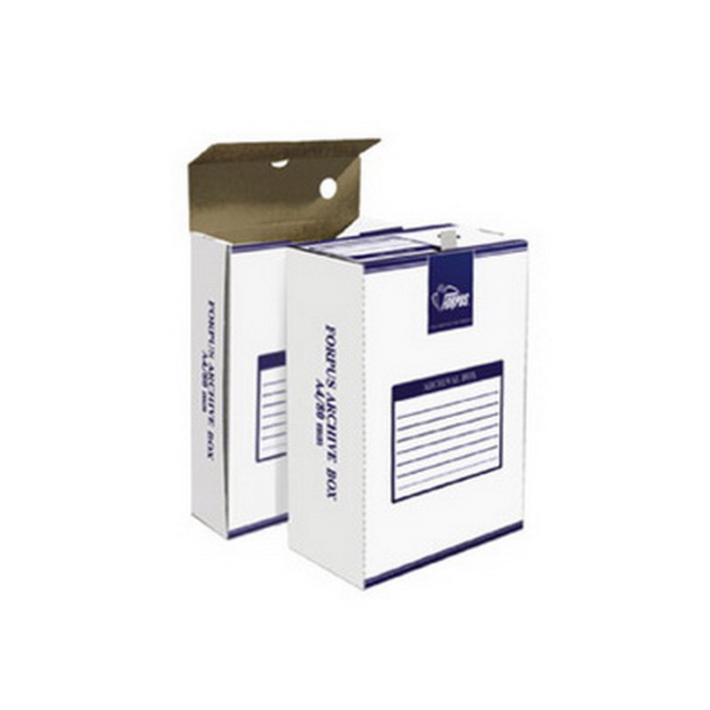 Archyvinė dėžė, A4. Matmenys (A x P x I): 340 x 245 x 120 mm. Pagaminta iš gofruoto kartono, nugarėlės storis 12 cm, atsidaro per trumpąją kraštinę.
