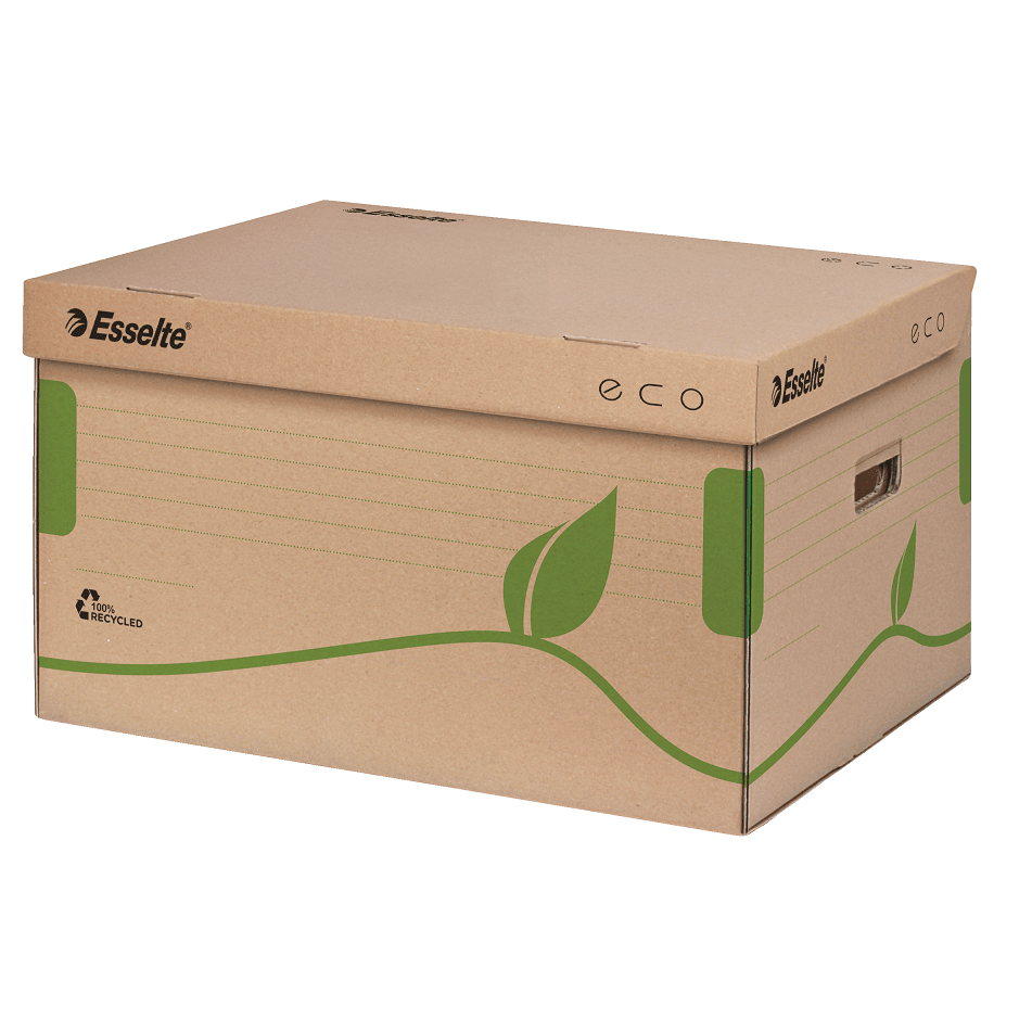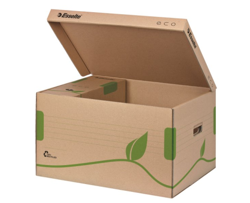 Archyvavimo konteineris, pagamintas iš 100% perdirbto kartono, sustiprintais šonais ir pagrindu,su atlenkiamu dangčiu sertifikuotas FSC. 439x242x345mm. Konteineryje telpa 5x80mm arba 4x100mm pločio Esselte Eco archyvinės dėžės. Rudos spalvos. 623918
