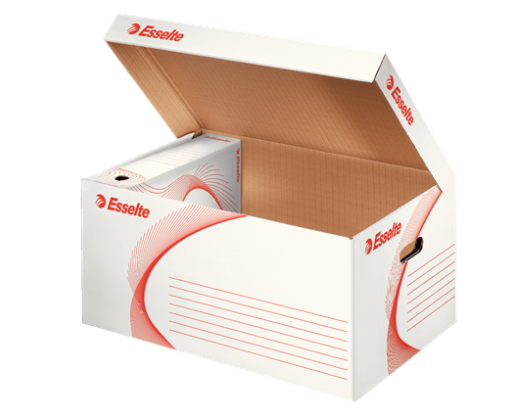 Archyvavimo konteineris, pagamintas iš 100% perdirbto kartono, sertifikuotas FSC. matmenys: 365 x 255 x 550mm. Konteineryje telpa 6x80mm arba 5x100mm pločio Esselte archyvinės dėžės. Baltos -raudonos spalvos. 128900