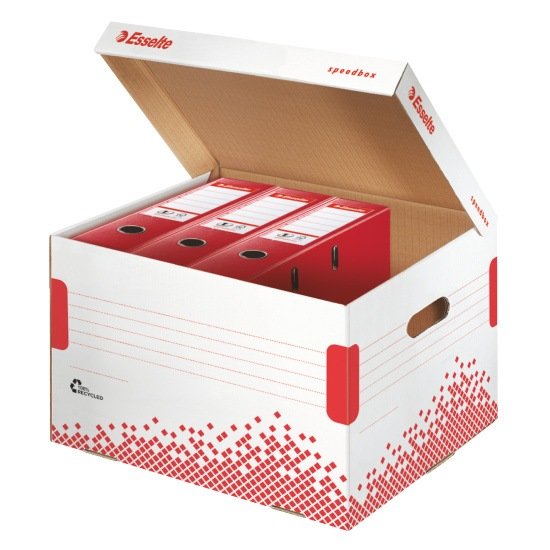 Archyvavimo konteineris, pagamintas iš 100% perdirbto kartono, sertifikuotas FSC. Matmenys: 392x301x334mm. Sustiprinti šonai ir pagrindas. Su dangčiu. Telpa 5 Esselte segtuvai su svertiniu mechanizmu (75mm nugarėle). Baltos - raudonos spalvos. 623914
