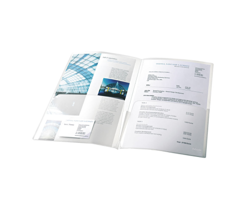 80 mikronų plastikas. Kiekvienoje pusėje į dėklą telpa iki 50 lapų. Speciali kišenėlė vizitinėms kortelėms. Matinis. A4 formato. Pakuotėje 5 vnt.