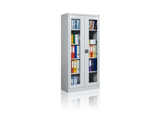Metalinė dokumentų spinta su stiklinėmis durimis BU-W/4 pagaminta iš 0,8-1,0 mm storio plieno ir nudažyta korozijai atsparia milteline emale. Spintos viduje 4 reguliuojamo aukščio (kas 90 mm) lentynos. Duryse įmontuotas tripusis užraktas su dviem raktais.