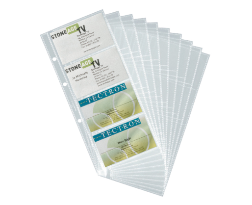 Papildomos įmautės vizitinėms kortelėms. Telpa 80 vizitinių kortelių. Pagaminti iš polipropileno, matiniai. Matmenys: 245x110 mm. Pakuotėje 10 vnt.
