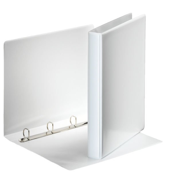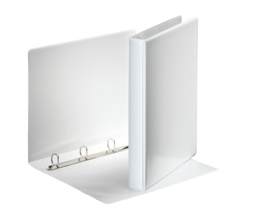 Su 4 žiedų įsegimo mechanizmu; Žiedo diametras 20mm; pagamintas iš kartono, dengto balto plastiko plėvele iš abiejų pusių; Kišenėlės ant nugarėlės ir viršelio skirtos individualiai informacijai;