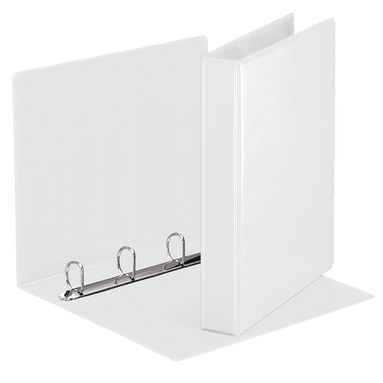 Su 4 žiedų įsegimo mechanizmu; Žiedo diametras 30mm; pagamintas iš kartono, dengto balto plastiko plėvele iš abiejų pusių; Kišenėlės ant nugarėlės ir viršelio skirtos individualiai informacijai; 49703.