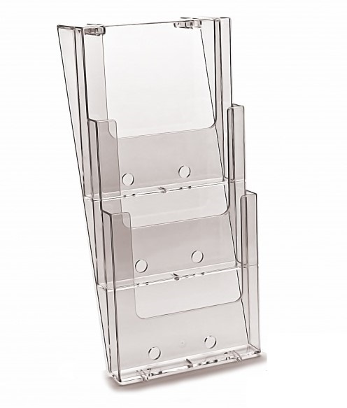 Pakabinamas bukletų laikiklis A4 3 skyrelių - kišenėlių išdėstytų horizontaliai. Tinka įvairiems reklaminiams ar informaciniams žurnalams ar skrajutėms laikyti. Laikiklis skaidrus, pagamintas iš smūgiams atsparaus polistireno. Dydis 3 x A4, išmatavimai (plotisxaukštisxgylis) 237x535x102 mm. 3W230-TA