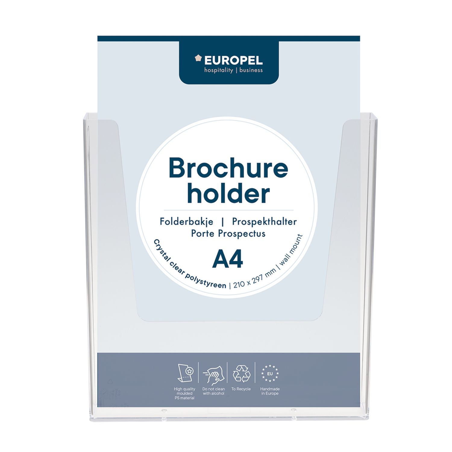 1 dalis; Formatas A4; Skirtas reklamai, akcijoms; Pakabinams; Skaidrus; Pagamintas iš aukštos kokybės poliestireno