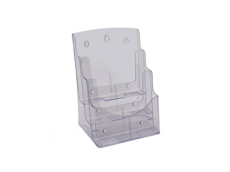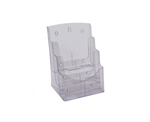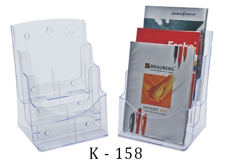 Spaudinių, brošiūrų stovelis K – 158, 3 skyrių pagamintas iš tvirto ir ypatingai skaidraus plastiko. Specialus apdirbimo būdas nepalieka aštrių briaunų ir sukuria malonų pojūtį liečiant. Savitos konstrukcijos dėka brošiūrų laikiklis gali būti kabinamas ant sienos arba pastatomas ant horizontalaus paviršiaus.