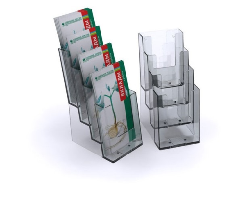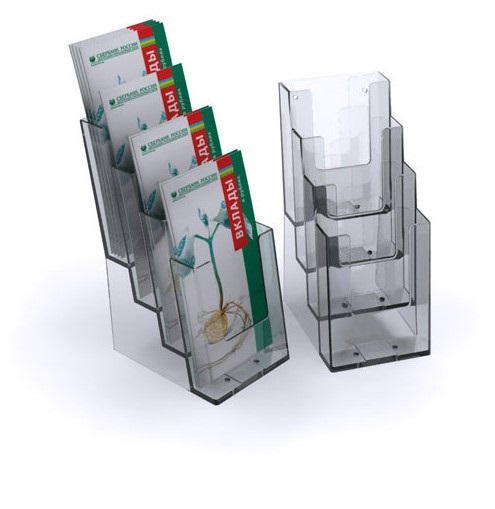 Universalus keturių pakopų bukletų laikiklis A4 (240mm X 342mm). Pastatomas arba pakabinamas.