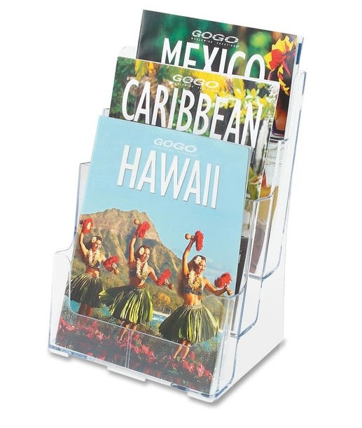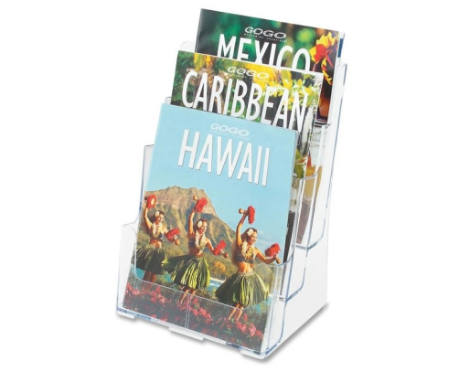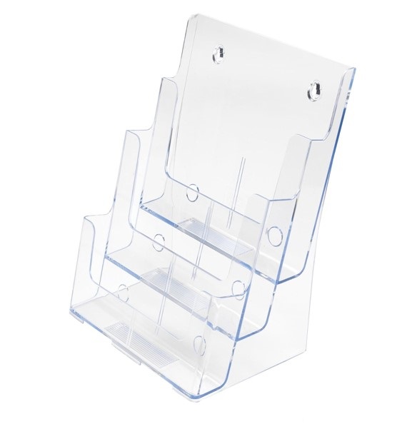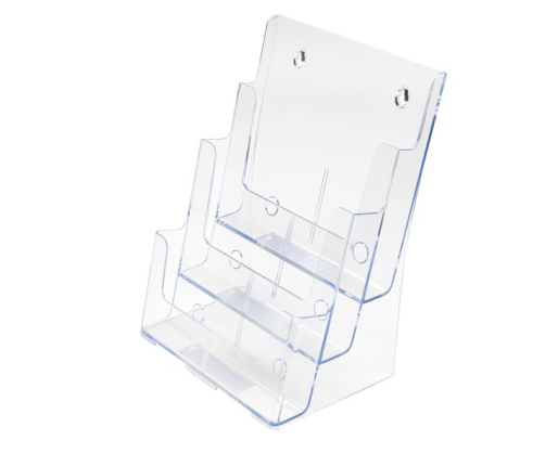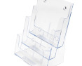 Universalus trijų pakopų bukletų laikiklis A4 (234mm X 318mm). Pastatomas arba pakabinamas. Galima naudoti su pertvaromis (6xA6 laikiklis).