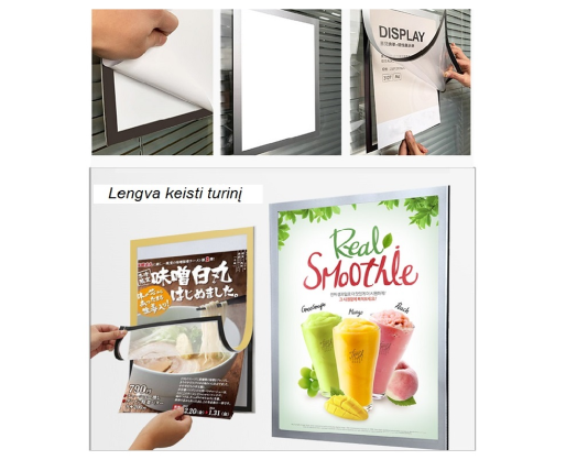 Labai lengvai keičiama informacija: atidarę vieną rėmelio dalį įdėkite lapą ir uždarykite.