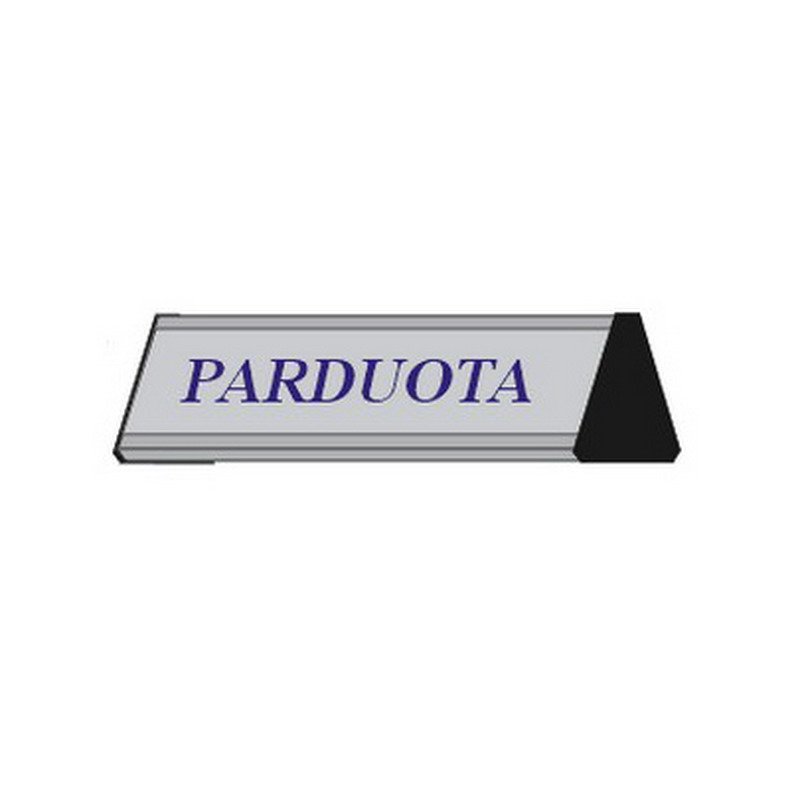 Informacinė lentelė 9.4. Medžiaga: anoduoto aliuminio profilis (pilkas) su juodais plastmasiniais antgaliais. Informacija talpinama iš abiejų pusių. Matmenys: 62 x 200 mm. Lentelėje informacija keičiama, nuo šono nuėmus trikampį antgalį. Po skaidria plėvele dviejose juostose talpinasi Jums reikalinga informacija: parduota, rezervuota, kaina ir t.t.