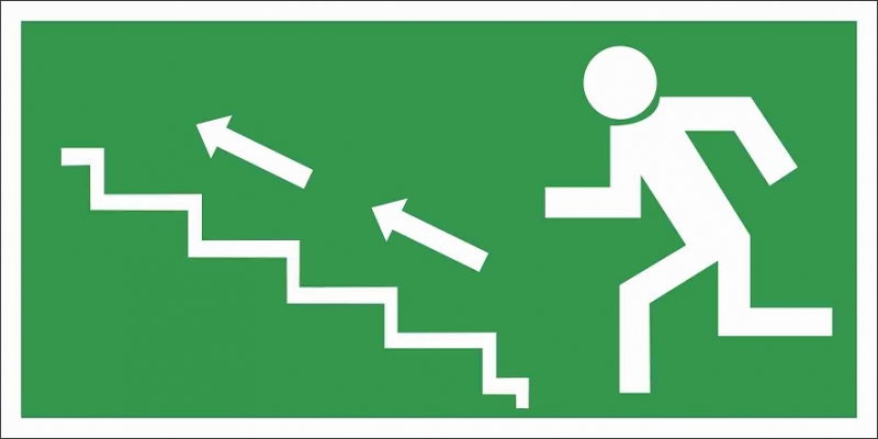 Informacinis lipdukas ''AVARINIS IŠĖJIMAS LAIPTAIS AUKŠTYN Į KAIRĘ'' ženklas 75x150mm