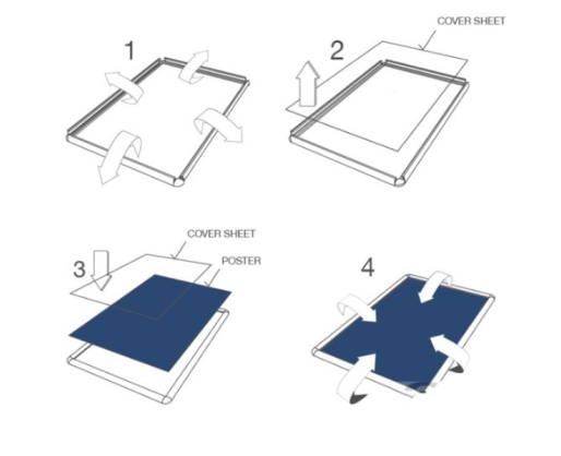 Užspaudžiamas vienpusis aliuminio rėmas stačiais kampais plakatams eksponuoti.