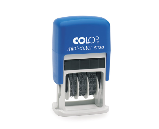 COLOP Antspaudas - datos spaudas Mini-Dater S120. Skirtas atspauduoti datai (Metai menuo diena). Tinka E/10 pagalvėlė. Atspaudo skaičiukų dydis 4 mm. ISO standartas YYYY-MM-DD. Labai mažas, patogus datos antspaudas skirtas kasdieniam naudojimui biure. Visi antspaudai su mėlynos spalvos pagalvėle. Kitų spalvų pagalvėlės ir korpusai - pagal specialų užsakymą.