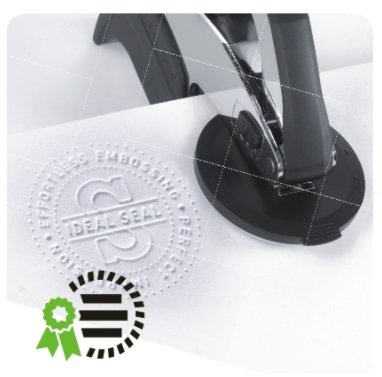 Reljefinis,įspaudžiamas antspaudas IDEAL, sidabrinės spalvos metalinis korpusas su juodo plastiko detalėmis, diametras Ø 41 mm. Įspaudžiamas į popierių iki 200g.