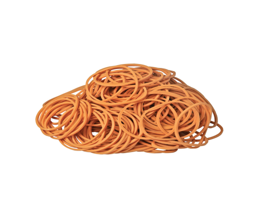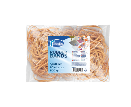 Pakuotėje 500 g rusvos spalvos gumelių. Diametras Ø 60 mm. Gumelės iš 80% latekso