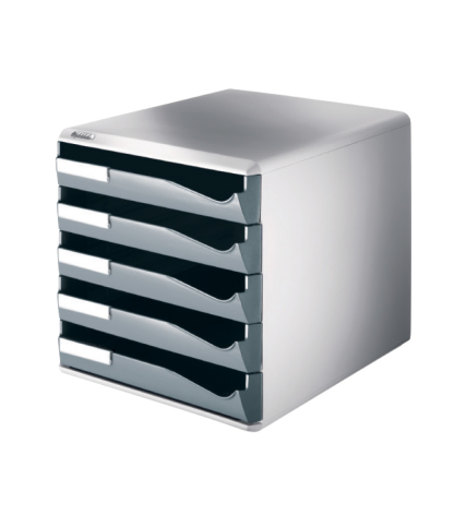 Stilingas 4 stalčių stovas,tinkamas naudoti A4 formato dokumentams; baltos spalvos korpusas, spalvotas stalčių vidus; 2 mažesni ir 2 didesni stalčiai matmenys: 287x270x363 mm. 52131044