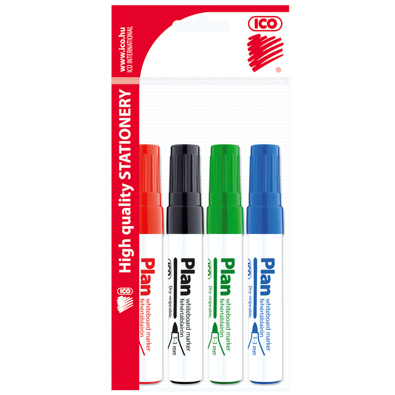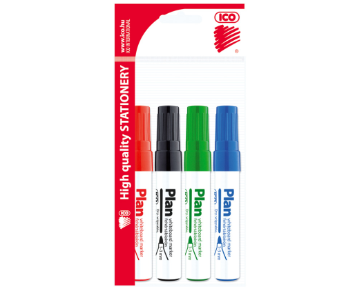 Žymeklių baltai lentai ICO PLAN rinkinys. Skirtas rašyti ant baltų magnetinių emaliuotų lentų. Užpildytas greitai džiūstančiu ir gerai nusivalančiu rašalu. Brėžio storis 2,5mm. Rinkinyje 4 skirtingų spalvų (raudonos, mėlynos žalios ir juodos) žymekliai.Prekės parametrai