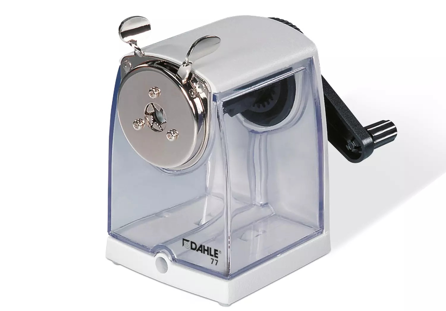 Rankinis drožtukas DAHLE 77 su konteineriu, tvirtinamas prie stalo, šviesiai pilkas