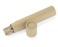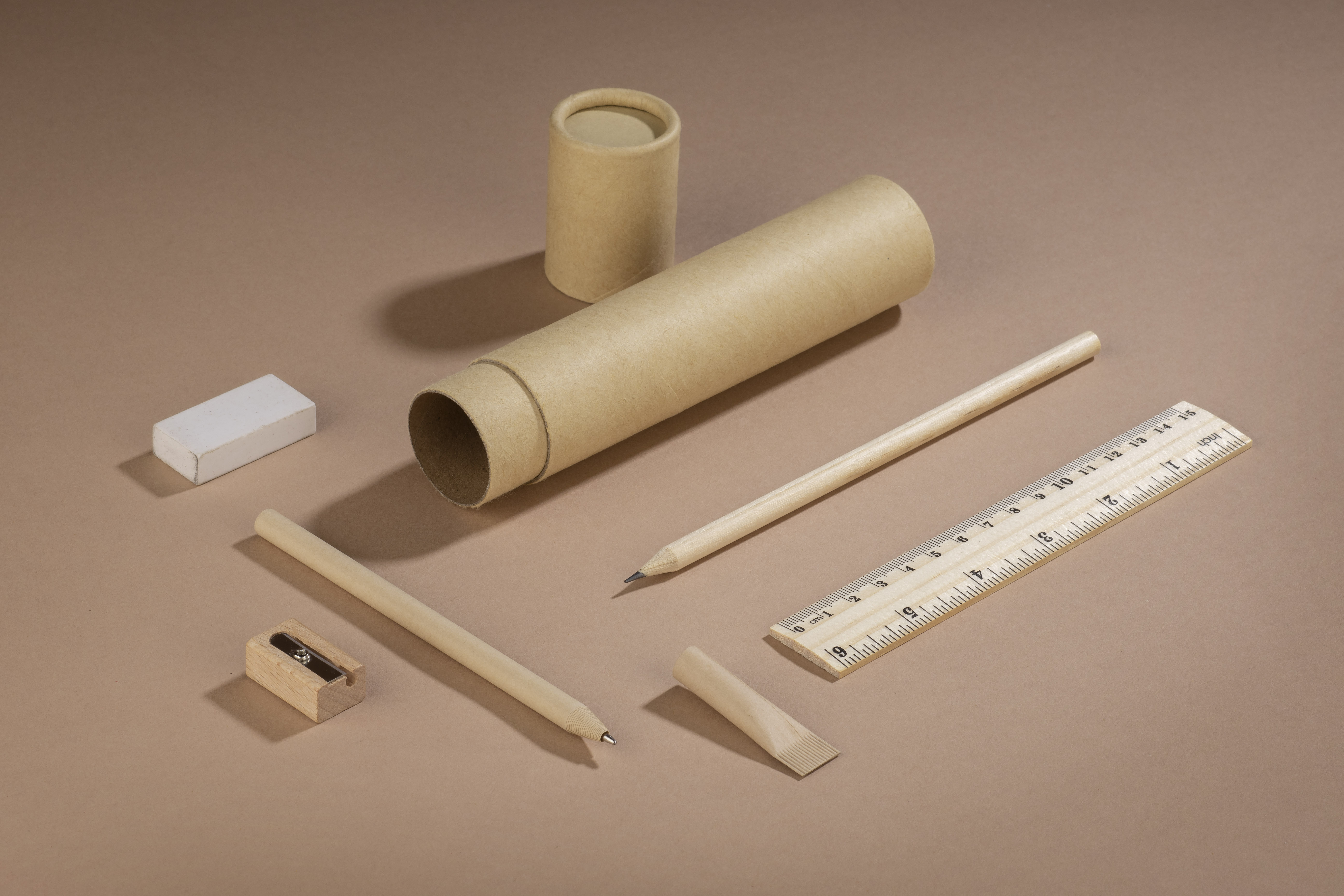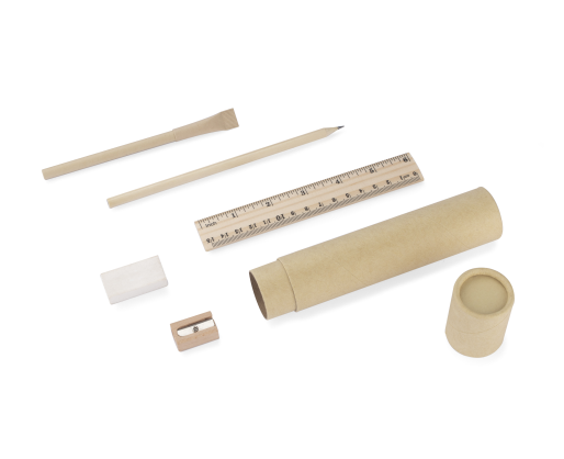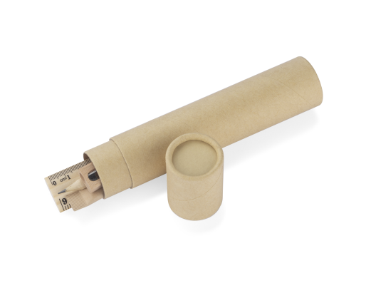 Ekologiškas pieštukų dėklas pagamintas iš vamzdelio formos kraftpopieriaus. Rinkinį sudaro: popierinis rašiklis ir medinis: pieštukas, drožtukas, liniuotė ir trintukas. Tampografijos būdu galimas logotipo uždėjimas.