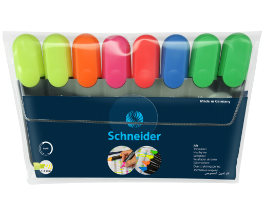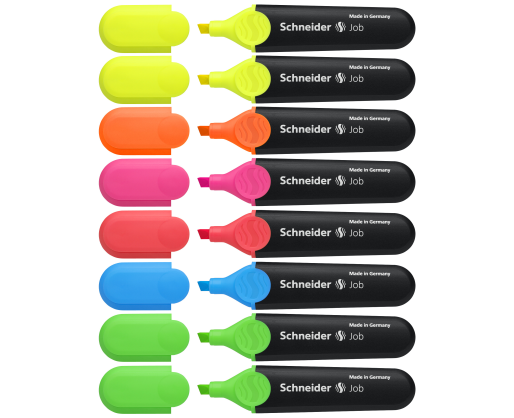 Teksto žymeklių Schneider JOB 8 vienetų 6 spalvų rinkinys: 2 vnt. geltoni, 1 vnt. oranžinis, 1 vnt. rožinis, 1 vnt. raudonas, 1 vnt. melynas ir 2 vnt. žali. Kirstas galiukas skirtas dviejų pločių linijoms, 1-5 mm.