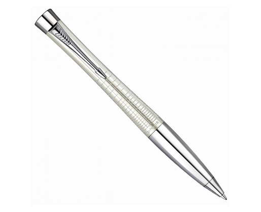 Tušinukas Urban Premium Pearl Metal Chiselled. Blizgiu baltu laku dengtas, stilingos formos rankomis graviruotas žalvario korpusas. Chromo apdailos detalės. Nerūdijančio plieno laikymo zona. Komplektuojamas su PARKER firmos tušinuko šerdele.
