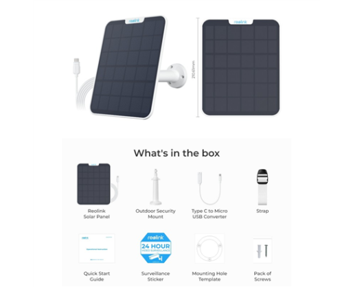 | Kitos savybės | Connect your Reolink solar powered camera to this solar panel with 4m connection cable (included) to get non-stop power. |