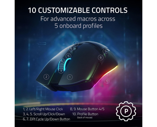 | Kitos savybės | 10 Customizable Controls; 11-Zone Chroma Lighting with Underglow; Razer Focus Pro 30K Optical Sensor |