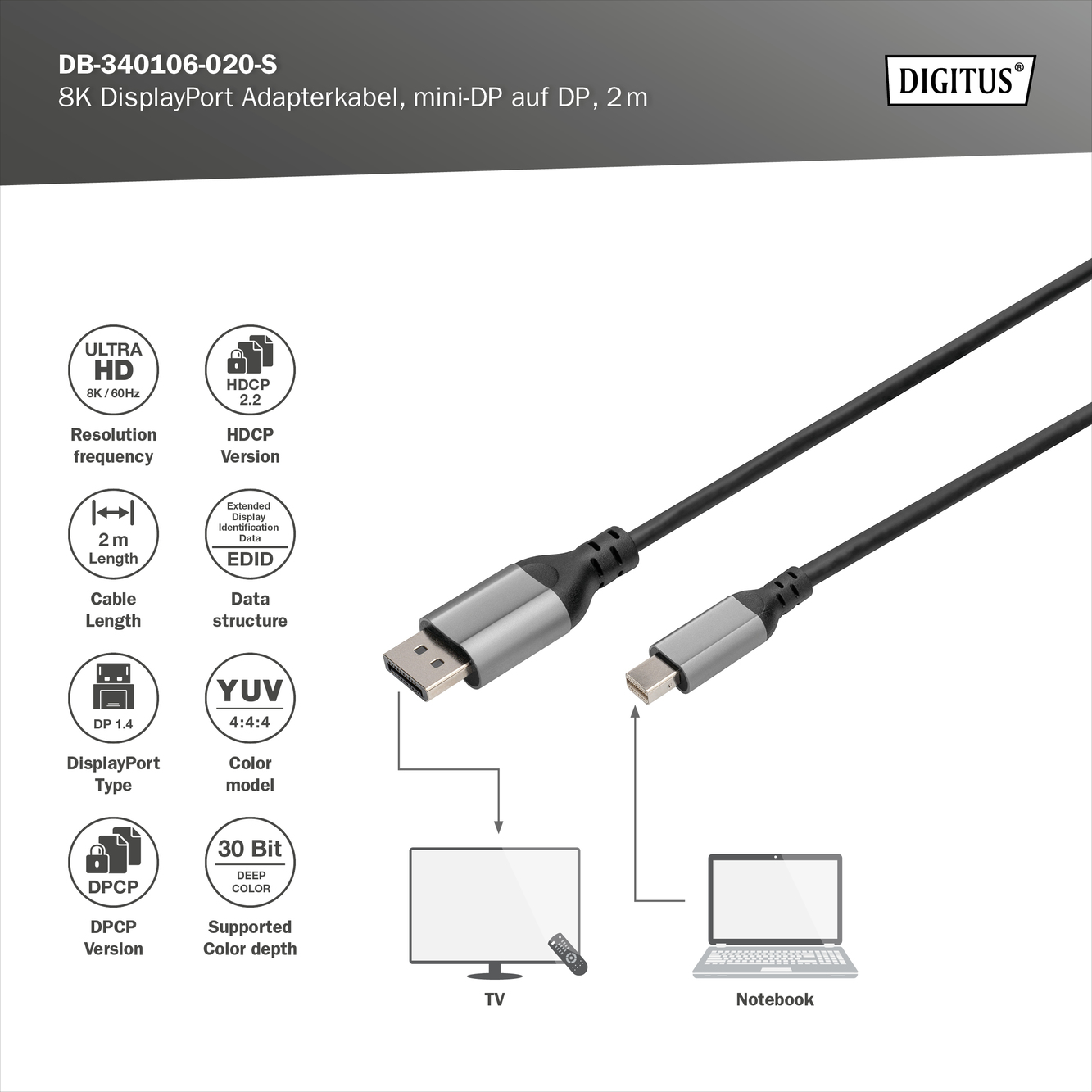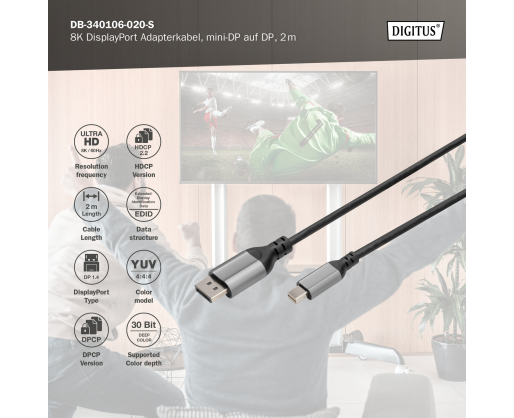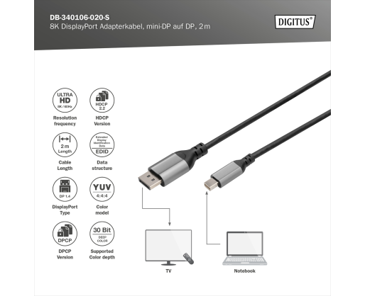 - Digitus 8K DisplayPort Adapter Cable, Mini DP to DP, 2 m | DB-340106-020-S | DisplayPor...