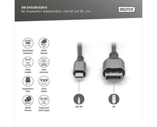 Digitus 8K DisplayPort Adapter Cable, Mini DP to DP, 2 m | DB-340106-020-S | DisplayPort to DisplayPort 473989