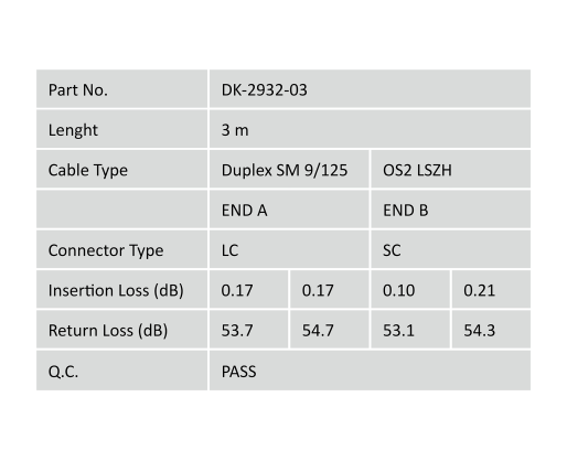 | Kitos savybės | Cable diameter 3 mm; Cable type: I-VH 2E9/125µ; Fiber diameter: 09/125µ; Connector 1/2: LC/SC |