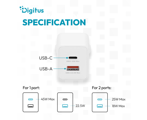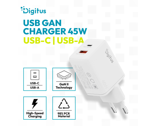 - Digitus USB GaN Charger 45W, 1x USB-C, 1x USB-A | DA-10302 603339