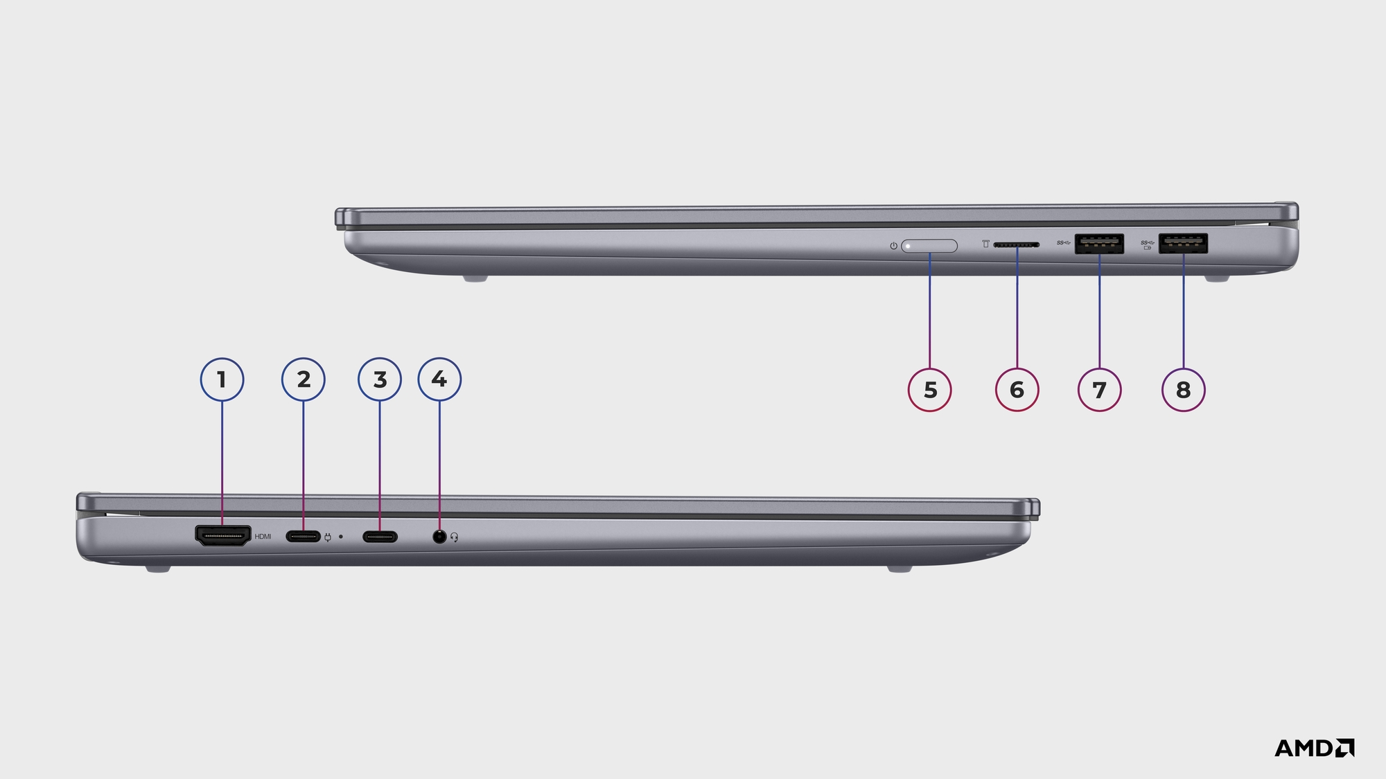 | Kitos savybės | 1x USB-A (USB 5Gbps/USB 3.2 Gen 1); 1x USB-A (USB 5Gbps/USB 3.2 Gen 1), Always On; 2x USB-C (USB 10Gbps/USB 3.2 Gen 2), with USB PD 3.0 and DisplayPort 1.4; 1x Headphone/microphone combo jack (3.5mm); 1x microSD card reader |