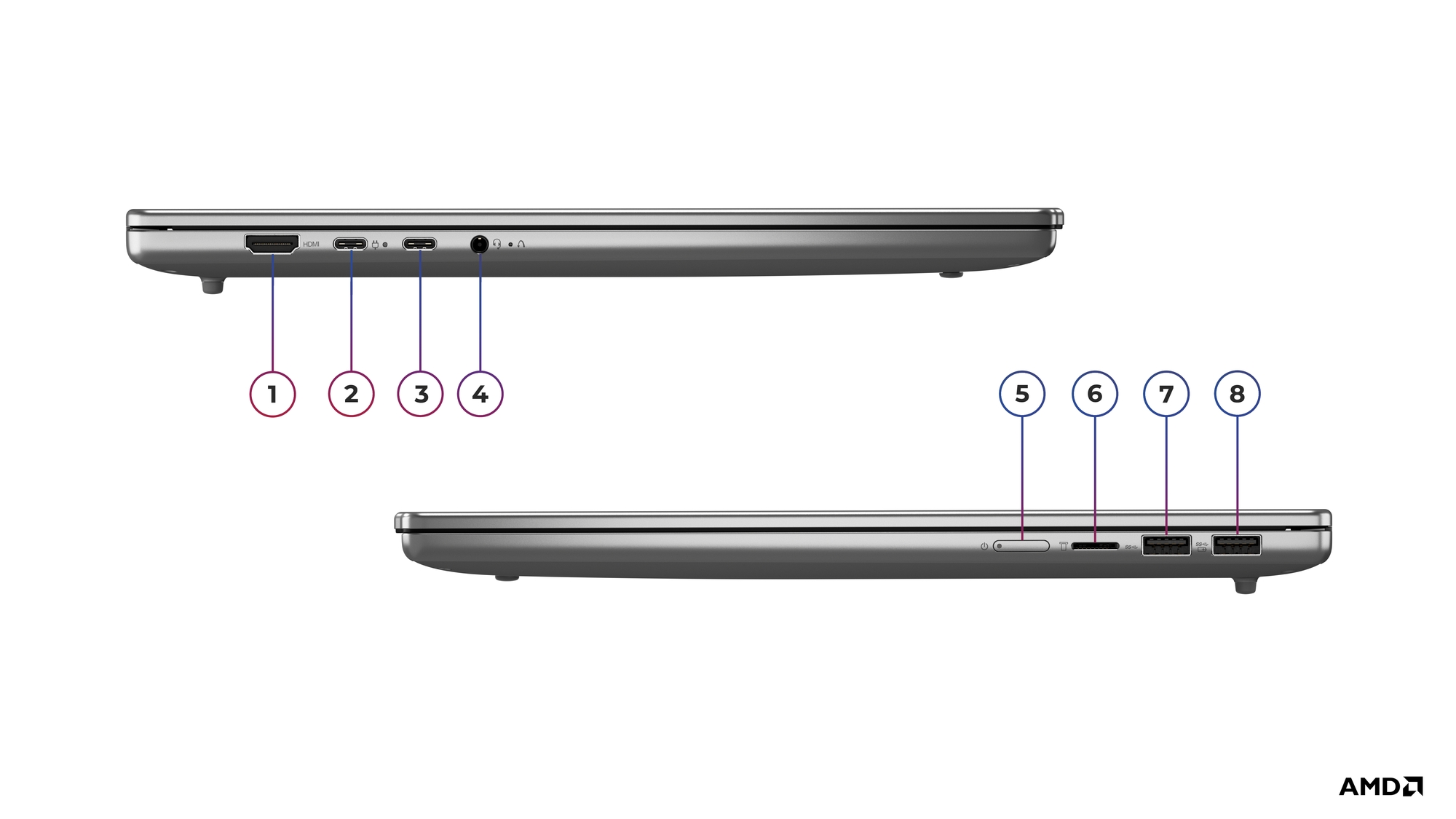 | Kitos savybės | 1x USB-A (USB 5Gbps/USB 3.2 Gen 1); 1x USB-A (USB 5Gbps/USB 3.2 Gen 1), Always On; 2x USB-C (USB 5Gbps/USB 3.2 Gen 1), with USB PD 3.0 and DisplayPort 1.4; 1x Headphone/microphone combo jack (3.5mm); 1x microSD card reader |