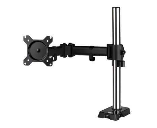 Vieno iki 38”/34” monitoriaus stovas su 4 prievadų USB 2.0 šakotuvu, juodasTvirtos plieninės konstrukcijos stovas stabiliai išlaiko iki 38 colių ekraną arba iki 34 colių 16:9 kraštinių santykio ekraną, sveriantį iki 15 kg. Skirtas tvirtinimui ant stalviršio.