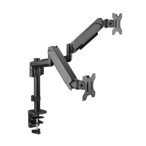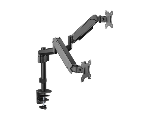 Dviejų 17“-32“ monitorių spyruoklinis stovas, juodos spalvosPlieno ir aliuminio konstrukcijos spyruoklinis stovas išlaiko du 17-32 colių ekranus, sveriančius iki 9 kg. Skirtas tvirtinimui ant stalviršio.