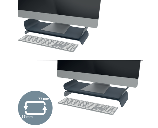 Galite pasirinkti iš dviejų aukščio nustatymų (55 mm / 77 mm) tiesiog apversdami monitoriaus stovą.