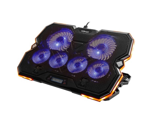 Nešiojamojo kompiuterio aušinimo stovas HiSmart DCX-A103, metalinis, 5 padėčių, sulankstomas, su 6x RGB ventiliatoriais, 2x USB 2.0 Type-A sąsajomis, juodos spalvos.Ypatybės: