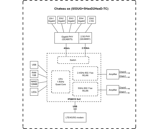 | Kitos savybės | Quad-Core IPQ-6010 1.8 GHz CPU, 1 GB RAM, LTE18 (1.2Gbps Downlink, 150Mbps Uplink), 1xMicro SIM slot, 1x2.5G Ethernet port |