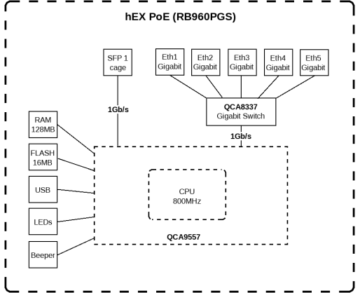 - Mikrotik Wired Ethernet Router RB960PGS, hEX PoE, CPU 800MHz, 128MB RAM, 16MB, 1xSFP, 5...