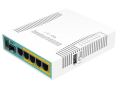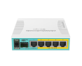 | Kitos savybės | hEX PoE is a five port Gigabit Ethernet router for locations where wireless connectivity is not required. The device has a USB 2.0 port and a SFP port for adding optical fiber connectivity. The ports 2-5 can power other PoE capable devices with the same voltage as applied to the unit. It is affordable, small and easy to use, but at the same time comes with a very powerful 800MHz CPU, capable of all the advanced configurations that RouterOS supports. Less power adapters and cables to worry about! Max current is 1A per port, Ethernet ports are shielded. It also supports passive PoE input and passive or 802.3af/at PoE output. Ethernet ports 2-5 can power other PoE capable devices with the same voltage as applied to the unit. Less power adapters and cables to worry about! It can power at/af mode B (4,5+)(7,8-) compatible devices, if 48-57 input voltage is used. |