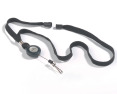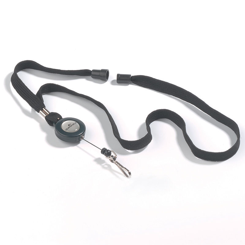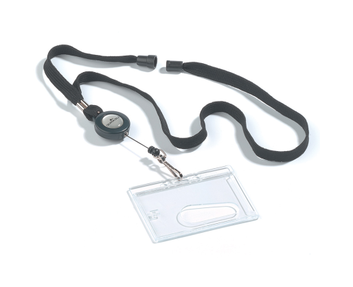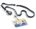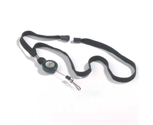 Tekstilinis dirželis su apsauginiu atsidarymu. Dirželis juodos spalvos. Turi metalinį spaustuką kortelių laikikliams prisegti. Virvutės ilgis iki 60 cm. Vardinė kortelė perkama atskirai (505-586). Dėžutėje 10 vnt.