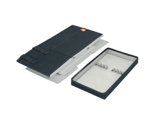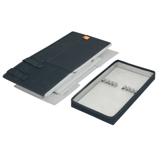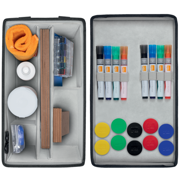 Lengvas ir stilingas audinio krepšys baltos lentos priedams turi magnetinį dangtį, skirtą patogiam magnetų laikymui, bei elastines kilpas, leidžiančias greitai pasiekti baltos lentos žymeklius. Visi reikalingiausi rašymo, planavimo ir valymo priedai yra vienoje vietoje, todėl komandos darbas tampa sklandus ir efektyvus.
