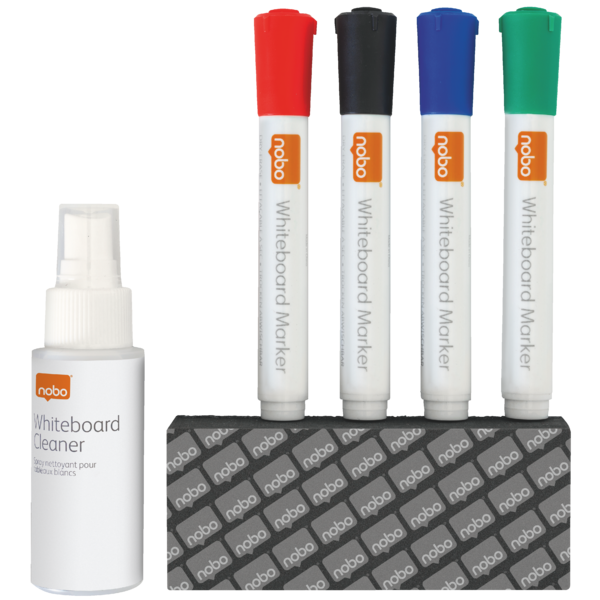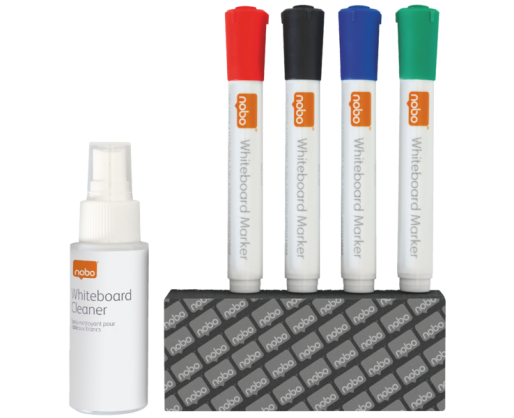 - Rinkinį sudaro 4 spalvų žymekliai, sauso valymo kempinėlė ir skystis lentai valyti
