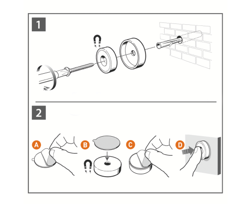 Magnetinius laikiklius prie sienos galima tvirtinti varžtais arba lipniomis pagalvėlėmis ant plokščių paviršių.