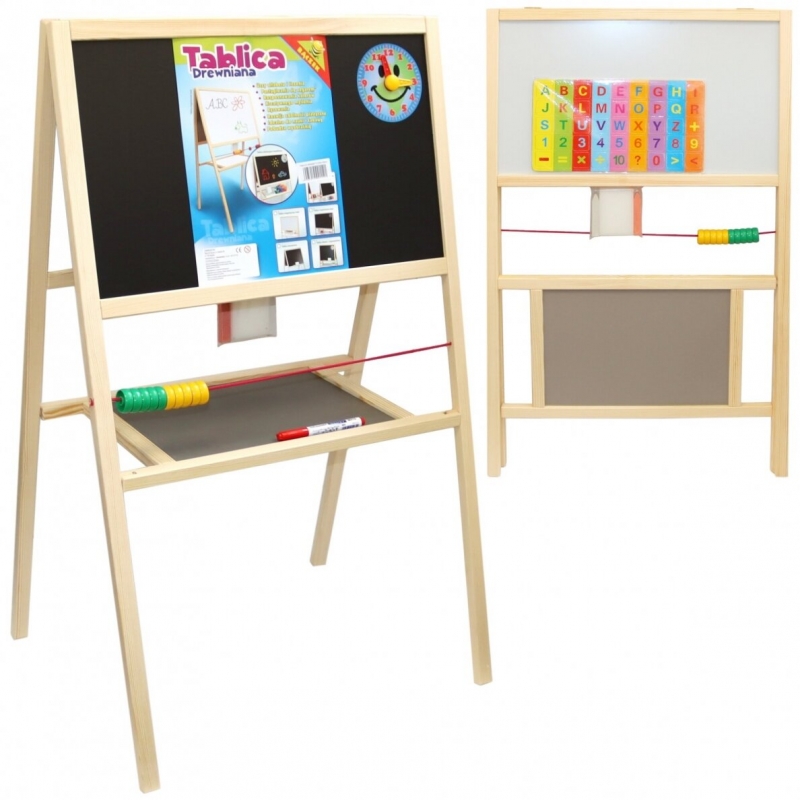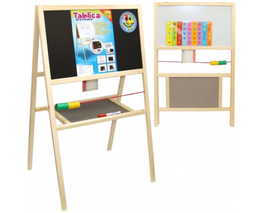 Magnetinė dvipusė rašymo lenta, skirta rašyti kreida arba žymekliais. Medinis rėmas. Matmenys: 53x45x88cm.