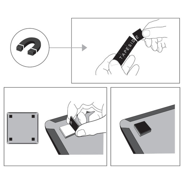 Tvirtinimui skirti lipnūs padeliai ir magnetai - galima montuoti ant sienos arba metalinio paviršiaus